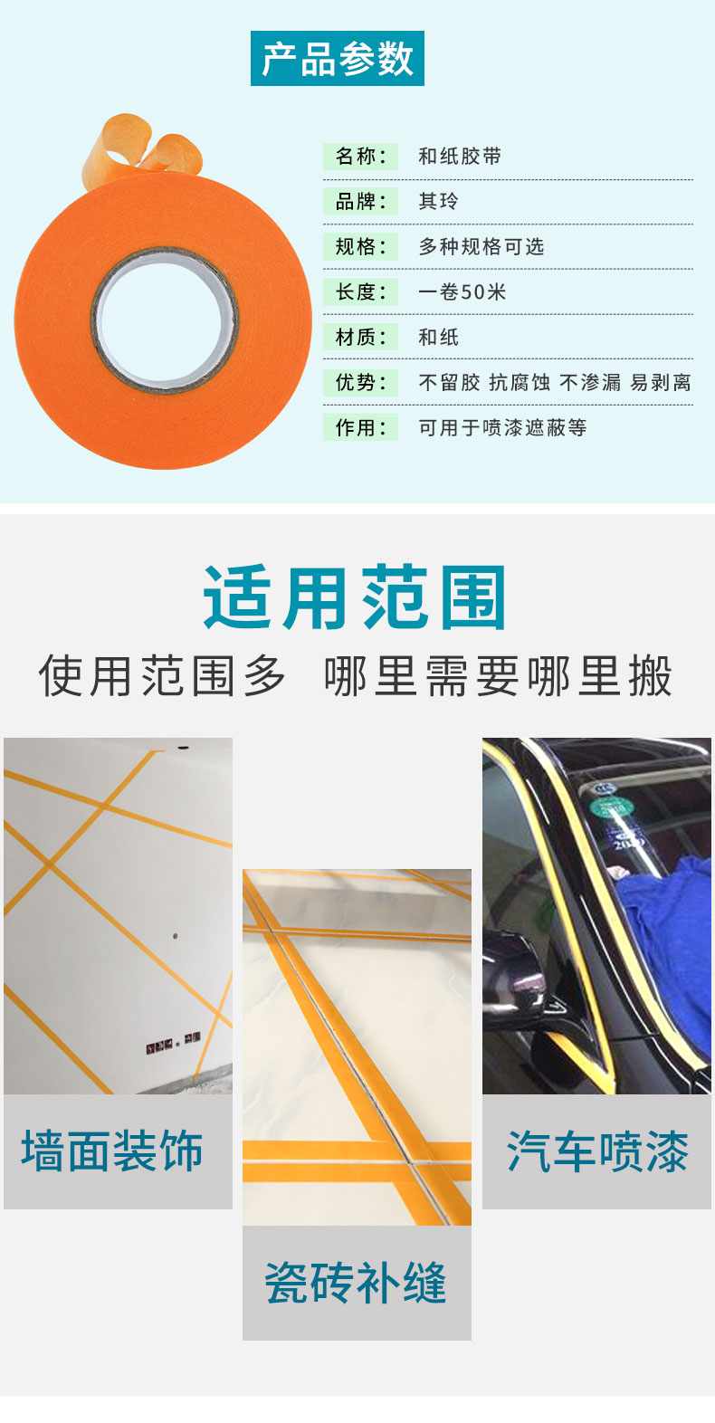 - 采用和紙為基材,紙質(zhì)柔和,適合運(yùn)動(dòng)器材、橡、塑膠部件及建筑工地、室內(nèi)、外裝潢、裝修噴、刷油漆時(shí)遮蔽用途。粘性適中,對(duì)大多數(shù)的平滑表面、彎曲或轉(zhuǎn)角處有很好的貼附性及遮蔽性,作業(yè)性良好,使用后快速撕除,不留殘膠。