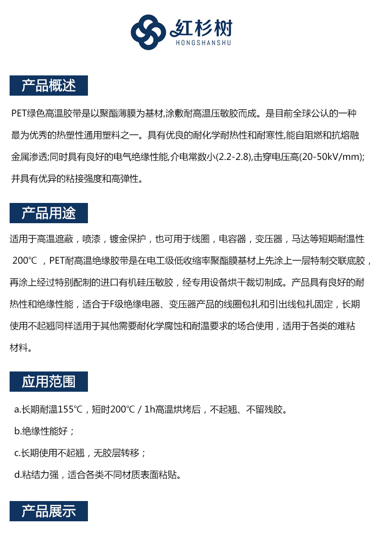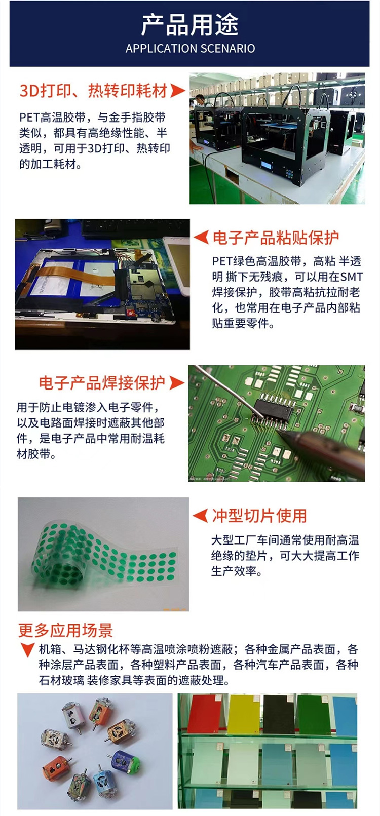 - PET綠色高溫膠帶是以聚酯薄膜為基材,涂敷耐高溫壓敏膠而成。是目前全球公認(rèn)的一種最為優(yōu)秀的熱塑性通用塑料之一。具有優(yōu)良的耐化學(xué)耐熱性和耐寒性,能自阻燃和抗熔融金屬滲透;同時具有良好的電氣絕緣性能,介電常數(shù)小(2.2-2.8),擊穿電壓高(20-50kV/mm);并具有優(yōu)異的粘接強(qiáng)度和高彈性。